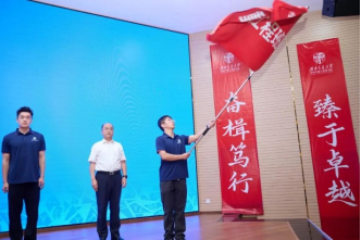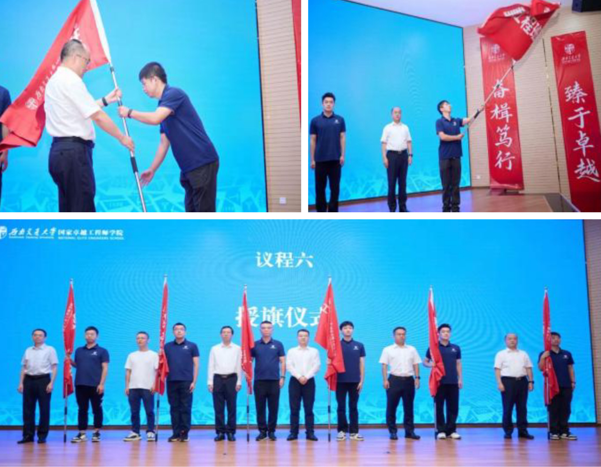 企业嘉宾及学院领导分别为工程硕博培养改革专项班、校企联合培养专项班、高原铁路战略储备人才班、智慧能源班、重大装备班、重大工程班授旗。