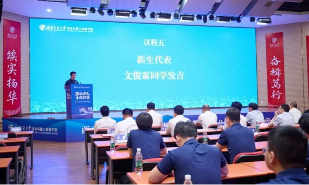 文俊霖同学作为新生代表发言,激励同学们要勇担时代重任,以“将科研论文写在生产车间”的决心与毅力,直面挑战、勇攀高峰,将科研与技术扎根于实践,用创新回应时代的召唤。