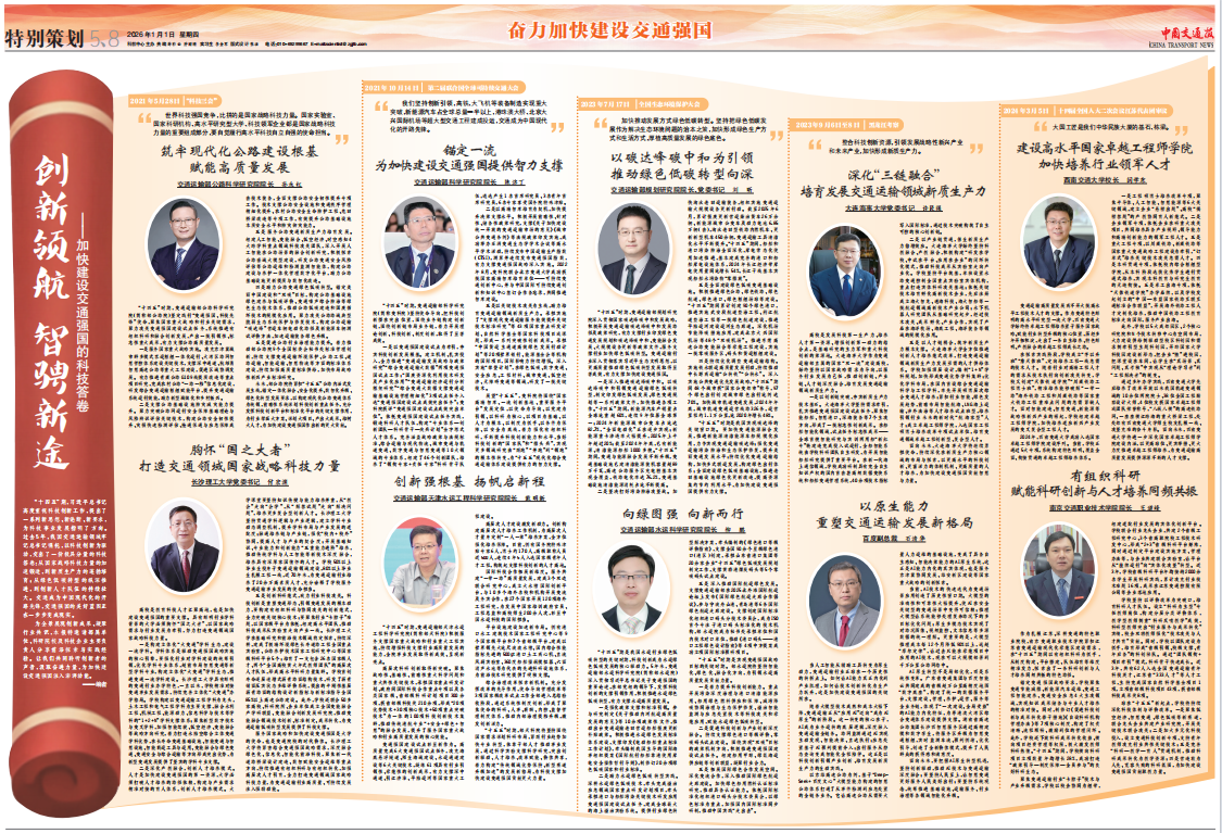 “十四五”期,习近平总书记高度重视科技创新工作,提出了一系列新思想、新论断、新要求,为科技事业发展指明了方向。过去5年,我国交通运输领域牢记习近平总书记嘱托,以科技创新为驱动,交出了一份极具分量的科技答卷:从国家战略科技力量的加速锻造,到新质生产力的蓬勃培育;从绿色低碳转型的纵深推进,到创新人才队伍的持续壮大。交通成为中国现代化的开路先锋,交通强国的美好蓝图正在一步步变成现实。为全景展现创新成果、凝聚行业共识,《中国交通报》特邀请西南交通大学校长闫学东分享前沿探索与实践经验。让我们共同聆听创新者的声音,汲取奋进力量,为加快建设交通强国注入澎湃动能。